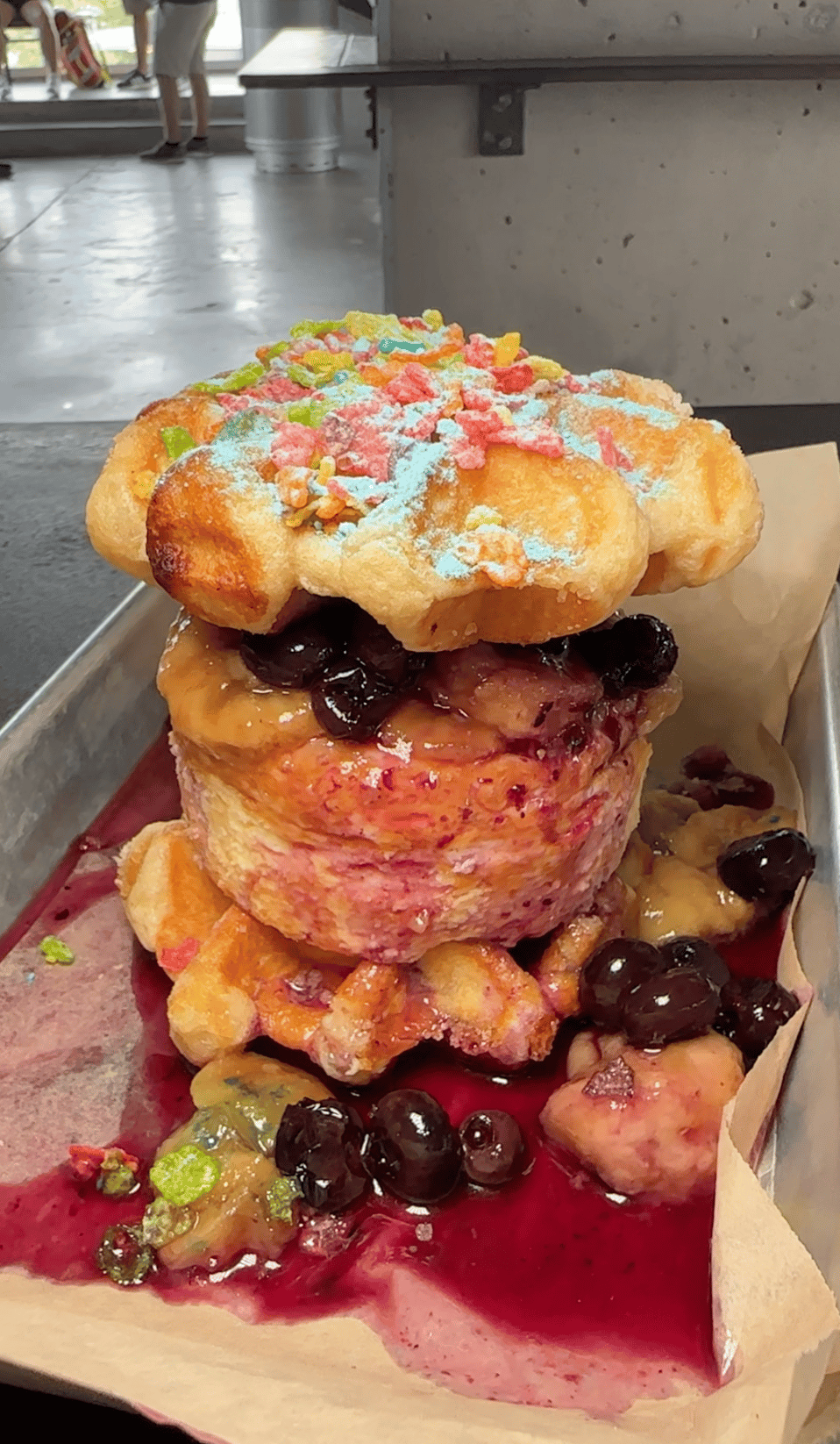 Kauffman Stadium is a wild place. It feels like a gigantic minor league stadium and it has that charm in many ways. There’s a mini golf course, I saw multiple playgrounds, there’s an ice cream parlor (speaking of sweets). But once you leave the never ending outfield concourse and make your way towards the action, there are some legit bites. One of which is the ridiculous in every way Back to Blueberry. They take basque cheesecake, top it with caramelized bananas and blueberry compote, sandwich it between two liege waffles and hit them with powdered sugar and Fruity freaking Pebbles. It’s a chore to eat, you’re gonna have to fork and knife it, and a few bites will suffice, but I can’t say it’s not delicious. And somehow it’s not too sweet.