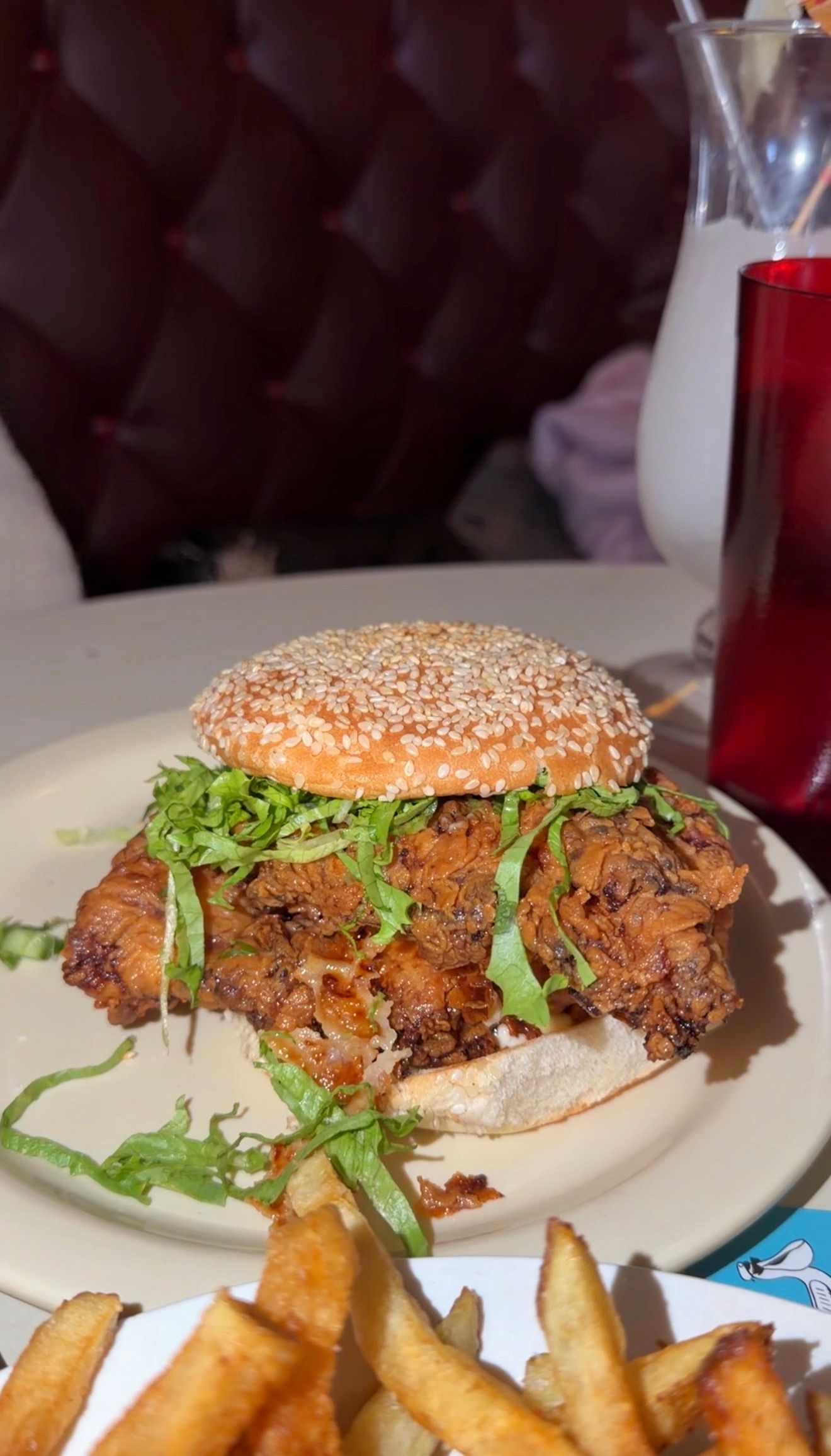 A few weeks back Marissa had told me about an incredible fried chicken sandwich she had in Brooklyn. It’s rare that she gets to a spot on my list before I do, but her endorsement carries a ton of weight—she’s not easily impressed. I’d been wanting to go for a while. It’s the coolest spot. Old school. I’m talking torn leather booths, one small TV in the corner of the bar with some old movie playing, paper umbrellas in frozen drinks. The place is a time warp in the best way. And the chicken sandwich is legit. Solid burger too.